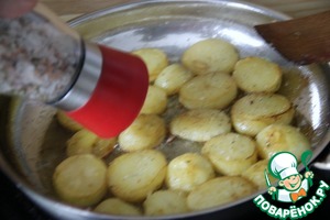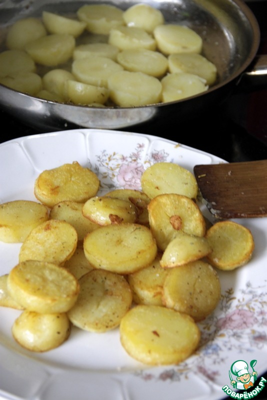 Обжарить следующую партию картофельных кружочков с обеих сторон.