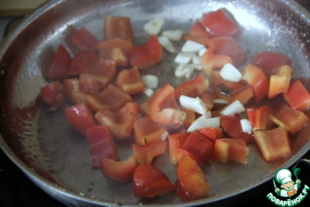 На сковороду, где жарился картофель, влить 1 ч. л. масла, добавить порезанный чеснок и сладкий перец, нарезанный кубиком, быстро обжарить, помешивая, до мягкости перца (2-3 мин.).