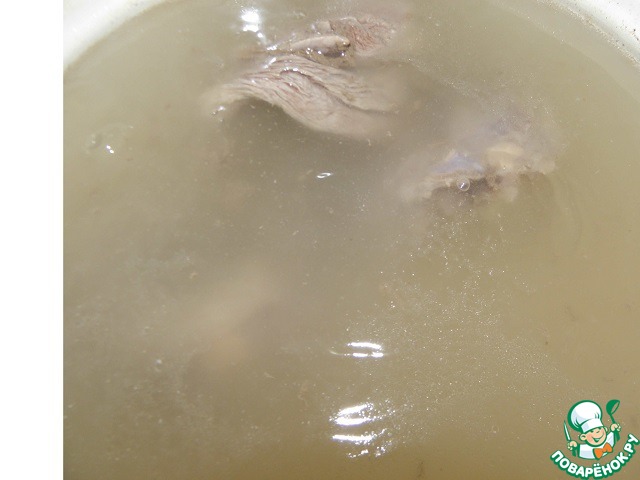 В кастрюлю налить воды и поставить варить мясо (1-1,5ч)