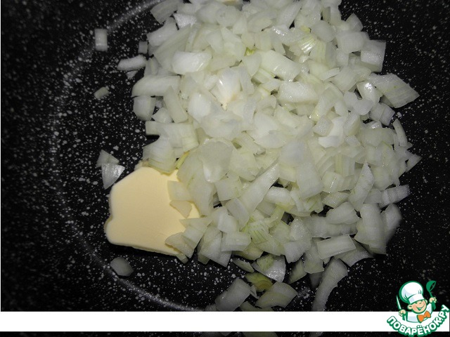 Смешать сливочное и чуть растительное масло, лук мелко нарезать и обжарить на сковороде с добавлением муки.