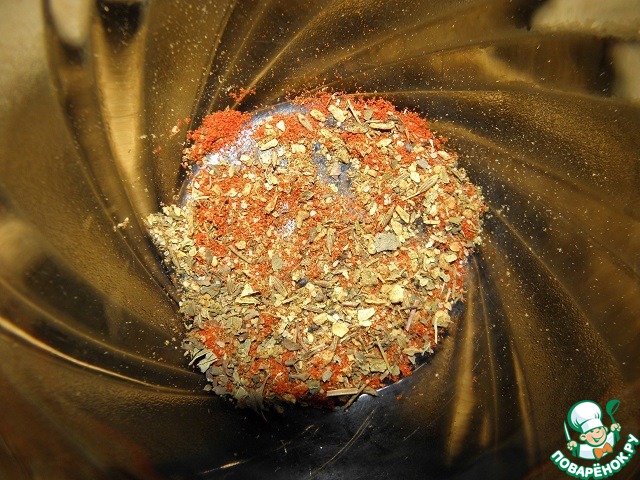 - Специи (Базилик,мята,черный перец и кориандр- по четверти чайной ложки, это в два раза меньше половины. Хмели-Сунели и паприки по 0,5 ч.л) — 1 ст. л.