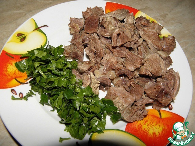 Когда мясо будет готово, достать его из бульона и порезать ( я режу мелко), а так по желанию. И нарезать немного свежей петрушки и кинзы ( вместе с частью стебля) Опустить мясо с зеленью в суп