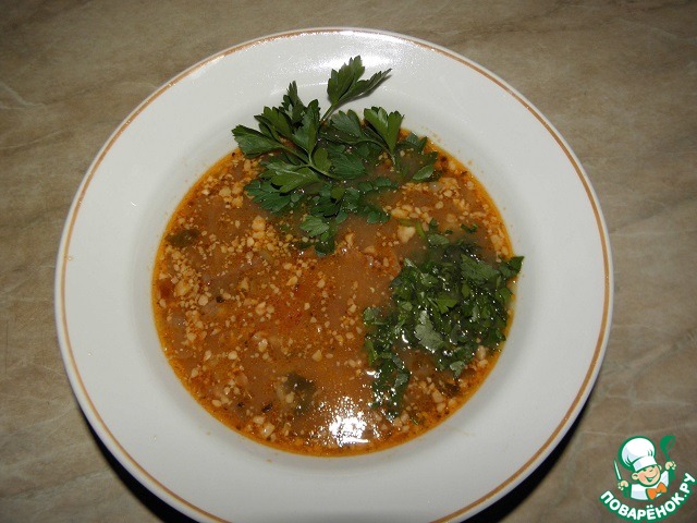Затем в бульон добавить рис и пережаренный лук с подливой, посолить по вкусу, через 10 минут добавить добавить сухие специи и орехи с чесноком. Протомить в районе 8-10 минут. Выключить и дать настоятся минут 15. Остальную зелень добавлять в тарелки. Приятного аппетита!