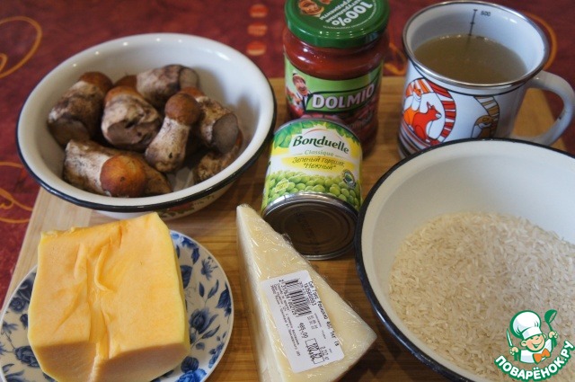 Подготовить продукты. Грибочки у меня были лесные - красноголовики, они не в пример ароматнее шампиньонов, а вместо кабачка - тыква. В рецепте не уточняется свежий должен быть горошек или консервированный. Свежего у меня не было и я взяла консервированный.