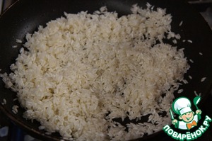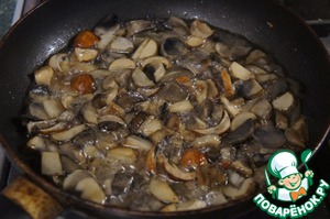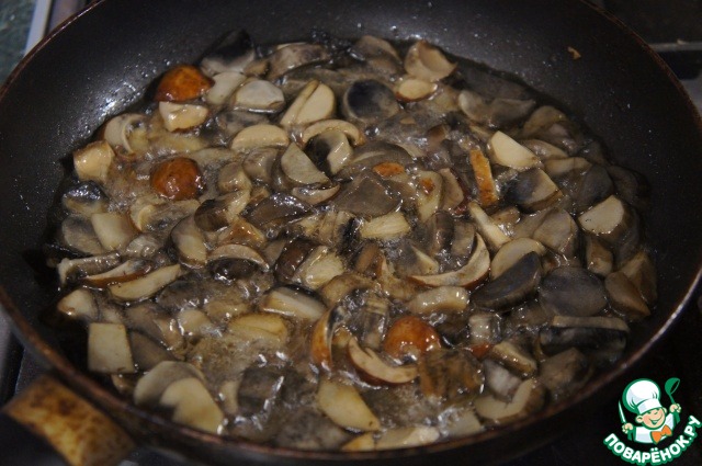 Пока готовится рис, свежие грибы почистить и нарезать дольками, поджарить на масле до готовности.