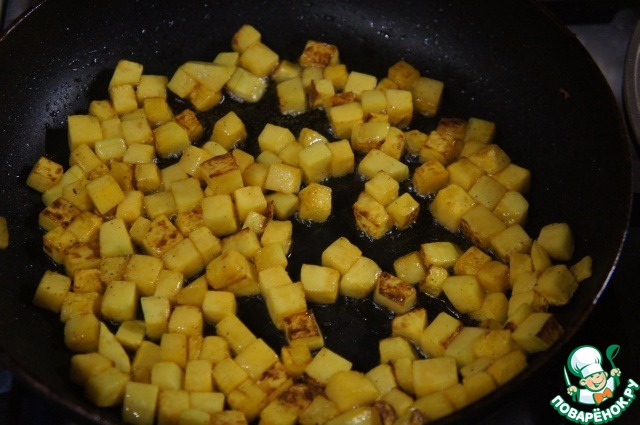 Кабачок (тыкву) очистить, нарезать кубиками и обжарить.