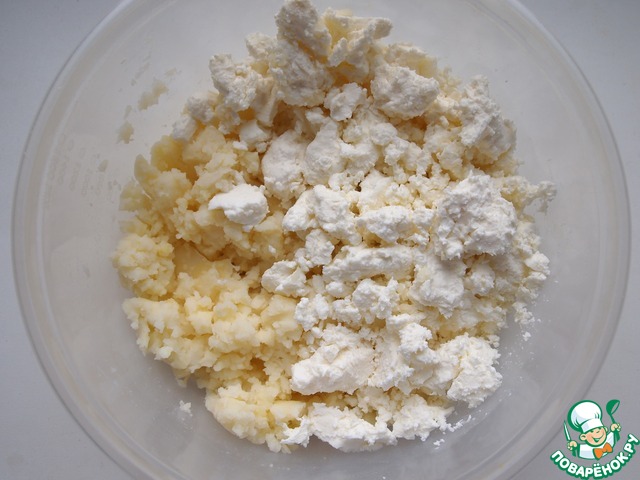 В картофельное пюре добавить творог, сахар, соль.