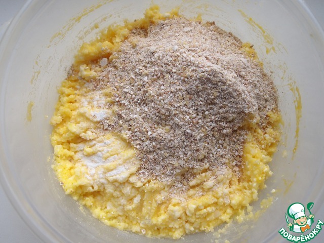 Добавить к творожно-картофельной массе измельченные хлопья и разрыхлитель. Хорошо перемешать.