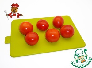 1. Ошпарьте томаты кипятком, снимите кожицу, затем разрежьте их на 2 части, удалите плодоножку, перец порежьте соломкой, чеснок очистите и порежьте на половинки. |