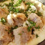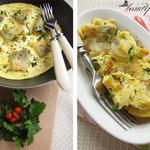 Существует и более "нежный" вариант блюда. Для него разделываем минтай на филе с кожей, а вместо репчатого лука используем порей. В остальном технология приготовления та же.