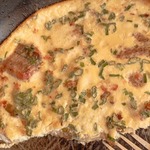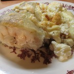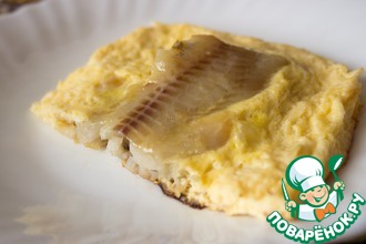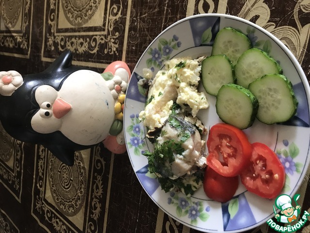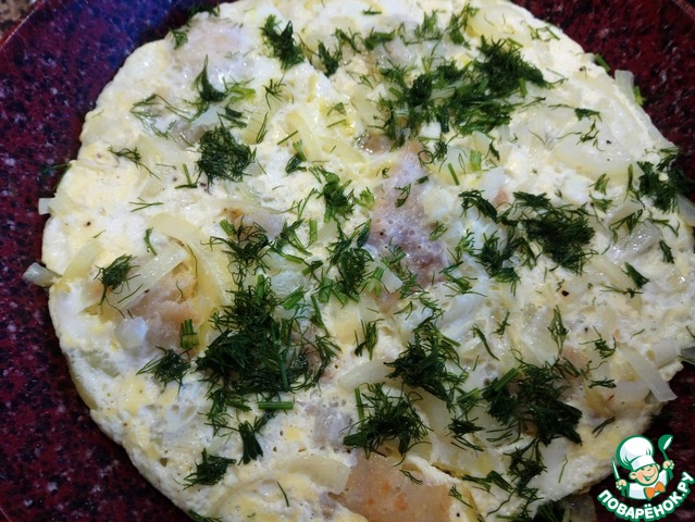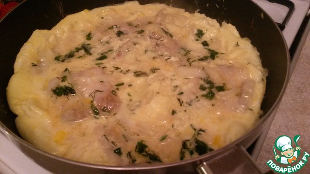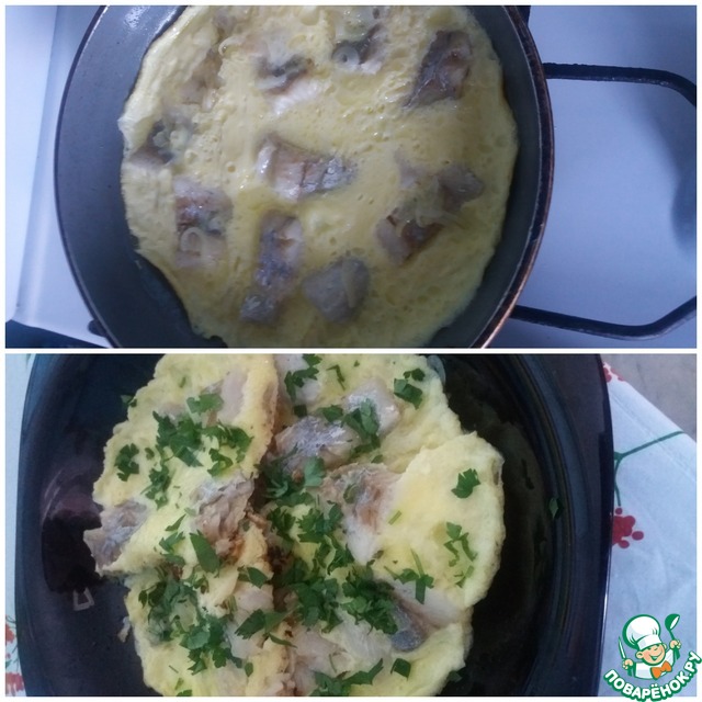 И зальем омлетом. Не нужно стремиться залить омлетом сковороду доверху, он не успеет пропечься. Высота омлета в сыром виде примерно до половины рыбы. Накрываем и тушим. Незадолго до готовности можно аккуратно подцепить ножом или вилкой кусочки рыбы, чтобы скопившаяся сверху жидкость подтекла под низ.