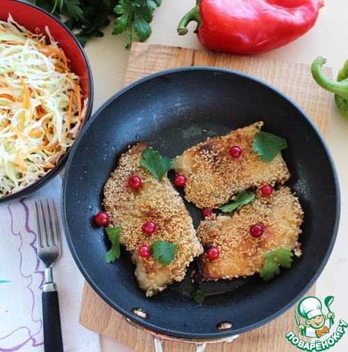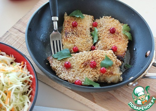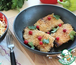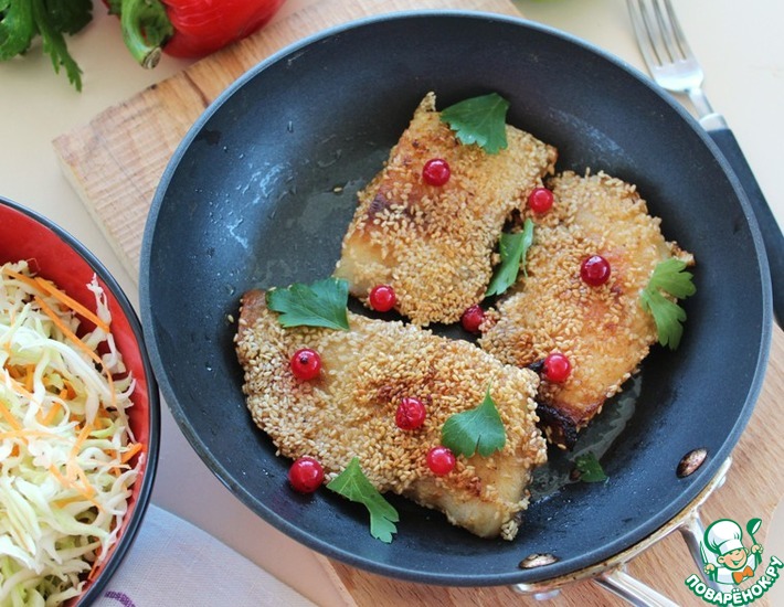 На календаре четверг, по старой советской традиции этот день считался рыбным. Не буду нарушать эту добрую традицию и хочу предложить вам рецепт рыбного филе в кунжуте. Нежное мясо рыбы, хрустящие семечки кунжута и как дополнение, сочные ягоды красной смородины или брусники, всё это вместе создает удивительное послевкусие.