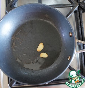 Если сковорода с хорошим покрытием, то для обжарки понадобится минимум растительного масла. Сковороду с маслом разогреть и обжарить пару зубчиков чеснока, масло ароматизируется, чеснок убрать.
