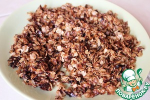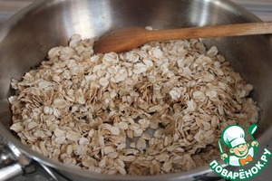 Добавляю сахар и постоянно перемешиваю. Овсяные хлопья покроются карамелью.
