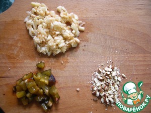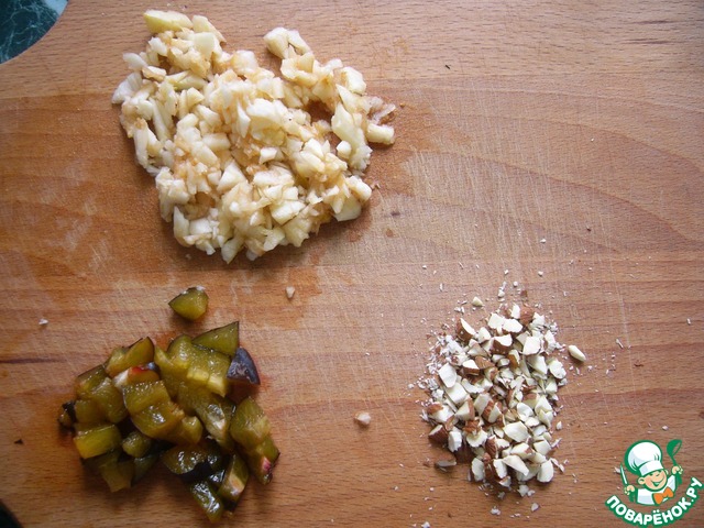 Серединки яблок, сливу и миндаль нарезать маленькими кусочками