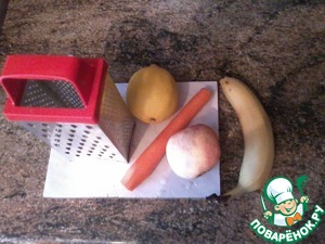 Морковь, яблоко и цедру натираем на МЕЛКОЙ терке, банан разминаем вилкой. в общей сумме должен получиться стакан фруктов, поэтому стартовый объем зависит от размера фруктов.