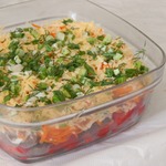 Салат можно подавать в общем салатнике, или для гостей делать в порционных вазочках, и слои можно не промазывать майонезом или сметаной, а на стол подать соусницы с йогуртом, майонезом или сметаной. Каждый выбирает сам свой любимый соус для заправки.