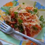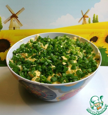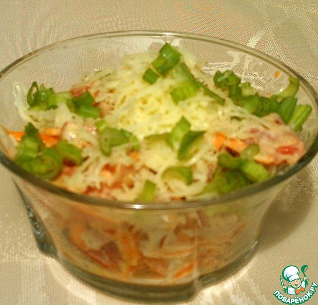 Сыр трем на средней терке и выкладываем на корейскую морковь, не прослаиваем. Сверху мелко нарубленный зеленый лук.