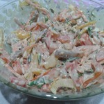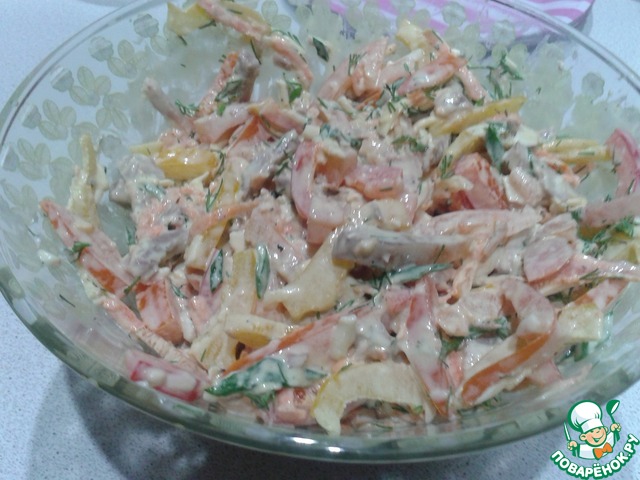 Помидоры и болгарский перец мелко порезать кубиком и выложить в салатник. Сверху нанести тонкий слой майонеза ( йогурта или сметаны), совсем немного, чтобы салат не "плавал", томаты и так дадут достаточно сока. Для красоты перец лучше брать разноцветный