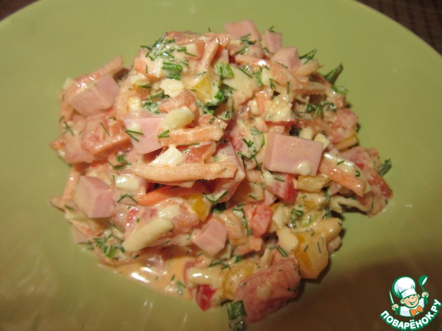 Далее слой мелко нарезанного кубиком мяса и тонкий слой майонеза, корейская морковь на очереди, и так же тонкий слой майонеза
