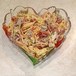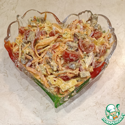 Шикарнейший и наивкуснейший салат. Без ложной скромности скажу, что это любимец на нашем столе! Просто готовится, но очень быстро съедается. Каждый ингредиент дополняет друг друга, что делает салат не повторимым в своем роде. Вроде бы настолько простые и доступные продукты, а вкус очень изысканный и не избитый. Угощайтесь.
