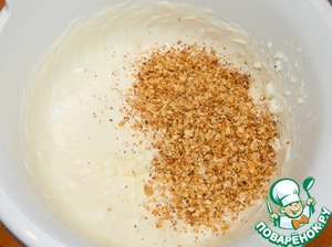 Сливки взбить с сахарной пудрой. Добавить к ним виски и хлопья. Перемешать.