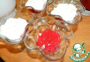 Выкладывать в креманки слоями сливки с хлопьями и малиновое пюре.