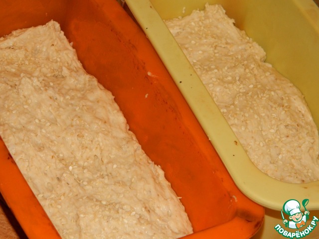• Затем тесто обмять лопаточкой и выложить в смазанную маслом форму. Посыпать кунжутом. Теста как раз на одну нормальную буханку, но я решила сделать 2 маленькие, чтобы бутеры с ними были, так сказать, на один зубок. Тесту дать подойти и испечь. Можно в духовке, можно в мультиварке. Я пекла в духовке при 180 С 45минут.