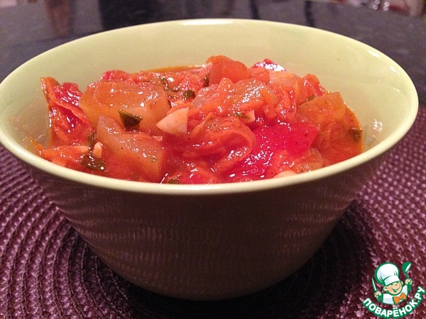 Кабачки (если не большие) режем кружочками, морковь натираем на крупной тёрке, перец режем не большими кубиками. Добавляем специи, сахар, соль, масло. Томатную пасту разводим в 1 литре воды и добавляем к овощам.