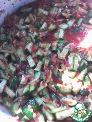Маринад-масло, сахар, соль и уксус, закипит+лук полукольцами 5 мин+перец соломкой 5 мин+томат, закипит-огурцы соломкой, после закипания варим 15 мин, периодически помешивая.