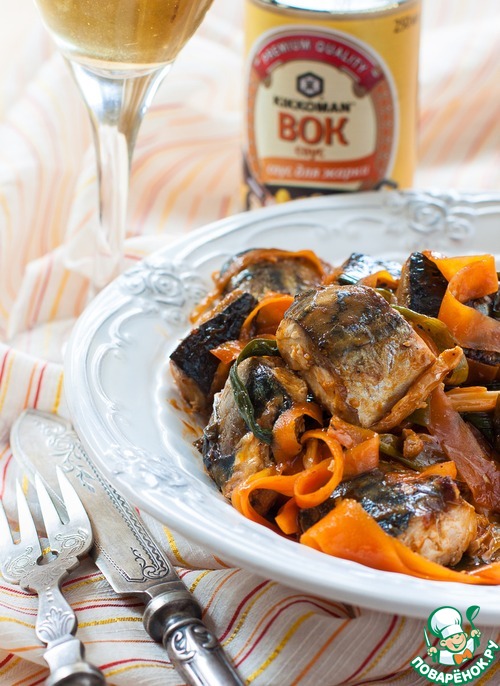 Разогреть в воке растительное масло и обжарить слегка кусочки скумбрии.