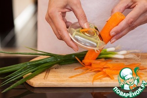 Очищенную морковь при помощи овощечистки нарезать длинными ленточками, лук нарезать кусочками длиной 10-15 см.