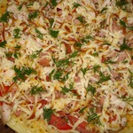 Горячую пиццу подаем к столу, можно посыпать зеленью.