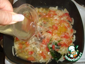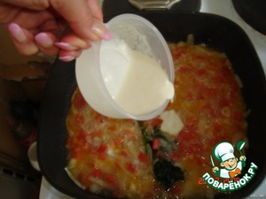 Мукой, разбавленной водой, загустить содержимое сковороды.