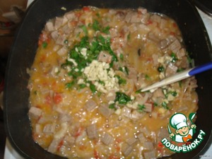 Добавить кубиками нарезанное мясо, петрушку и чеснок и перемешав дать потушиться минут 10-15.