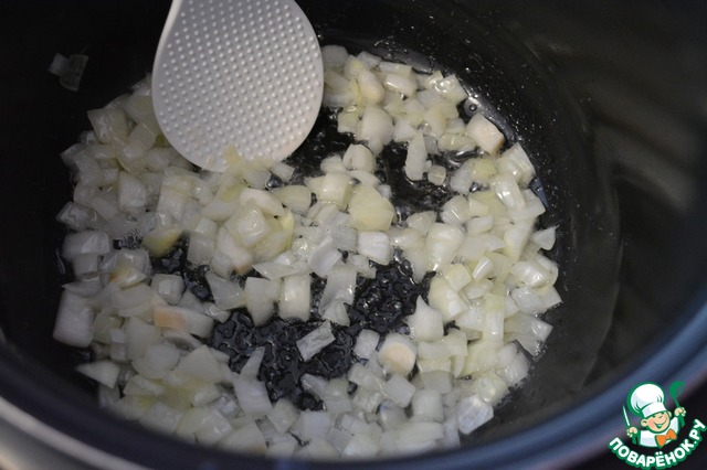 Затем включаем мультиварку в режим "Жарка" и обжариваю на растительном масле по очереди: лук, минуты 2-3. -