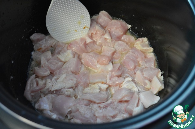 Куриное филе, обжариваю минут 5-7 (после того как выпарится вода).