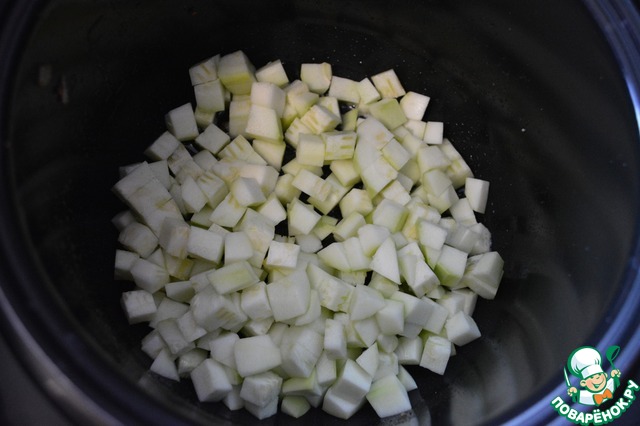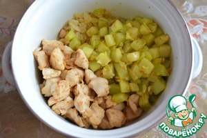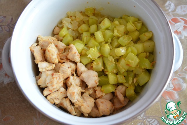Куриное филе тщательно мою и режу кусочками. Кабачок мою, счищаю кожуру и нарезаю кубиками. Репчатый лук чищу и мелко режу.