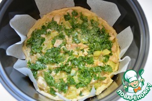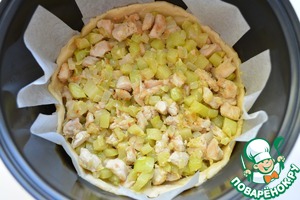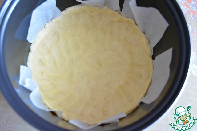 Чашу мультиварки застилаю полосами пекарской бумаги, чтобы потом было удобно вынуть пирог. Тесто вынимаю из холодильника, кладу в чашу и руками разминаю его. Формирую бортики, высотой примерно 2-3 см.