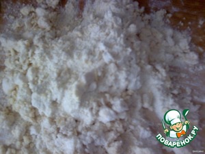 Маргарин порубить с мукой, добавить половину сахара, яйцо, соль, соду.