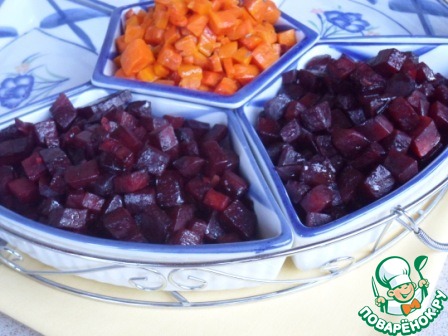 Морковь и свеклу вымыть и отварить 15-20 минут в разных кастрюльках.
