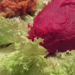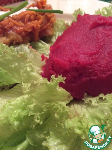 Сервируем: на подогретую тарелку выкладываем свекольное пюре (у меня оно, правда, получилось жидковатым... но от этого не менее вкусным), сверху рыбу и дополнительный гарнир. Немного сбрызните все сверху оливковым маслом, и можно подавать!