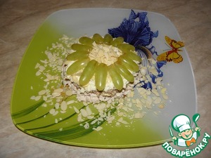 Выложить салат слоями: 1слой, половина куриного филе 150гр)- пропитать соусом. 2 слой половина сыра (70-100г), пропитать соусом. 3ий слой измельченные орехи с соусом. 4ый слой половина яиц с соусом. 5ый слой ( оставшуюся курицу, 6 слой сыр, 7ой слой яйца) 8ой слой посыпать миндальной стружкой и выложить сверху виноград.