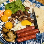 Грибы отодвинуть в сторонку и разбить яйцо, выложить сосиски, бекон, фасоль в томатном соусе и жарить до готовности яичницы.