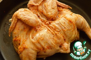2. Цыпленка вымыть. обсушить. Хорошо обмазать ароматной смесью и оставить на 30 минут. Переложить цыпленка на сковородку и запечь при 180С до готовности. У меня ушло 30 минут.