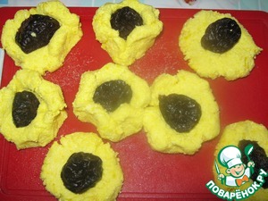 Делим творожную массу на 11 частей, делаем лепёшку и кладём на середину чернослив без косточки.