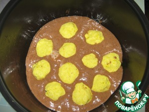 Смазываем чашу мультиварки маслом, выкладываем половину теста, сверху распределяем шарики.