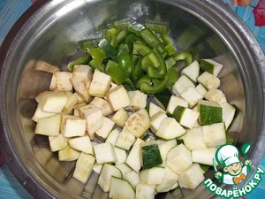 Цуккини, баклажан ( баклажан я очистила от кожицы), болгарский перец нарезать кубиками. Цуккини и баклажан у меня были средние, так что я брала по половинке. Помидоры, лук, чеснок и кусочек имбиря измельчить в блендере. Пару веточек базилика, петрушки или сельдерея мелко порубить.