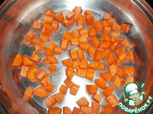 Морковь нарезать кубиками или кружочками, кому как нравится. С нее то мы и начнем: в сотейник выложить морковь и припустить в небольшом количестве воды 2-3 минуты.