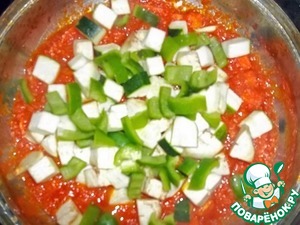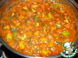 Томатное пюре прожарилось, добавить остальные овощи (цуккини, баклажан и болгарский перец),